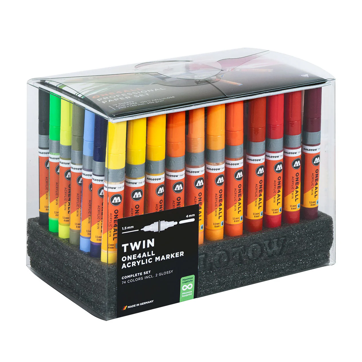 Le luxe ultime : les 74 couleurs Molotow en mode Twin Marker : un côté fin et un côté plus épais, parfait pour les sketchs, coloriages et stickers. Livrés dans leur coffret de rangement et leur support.