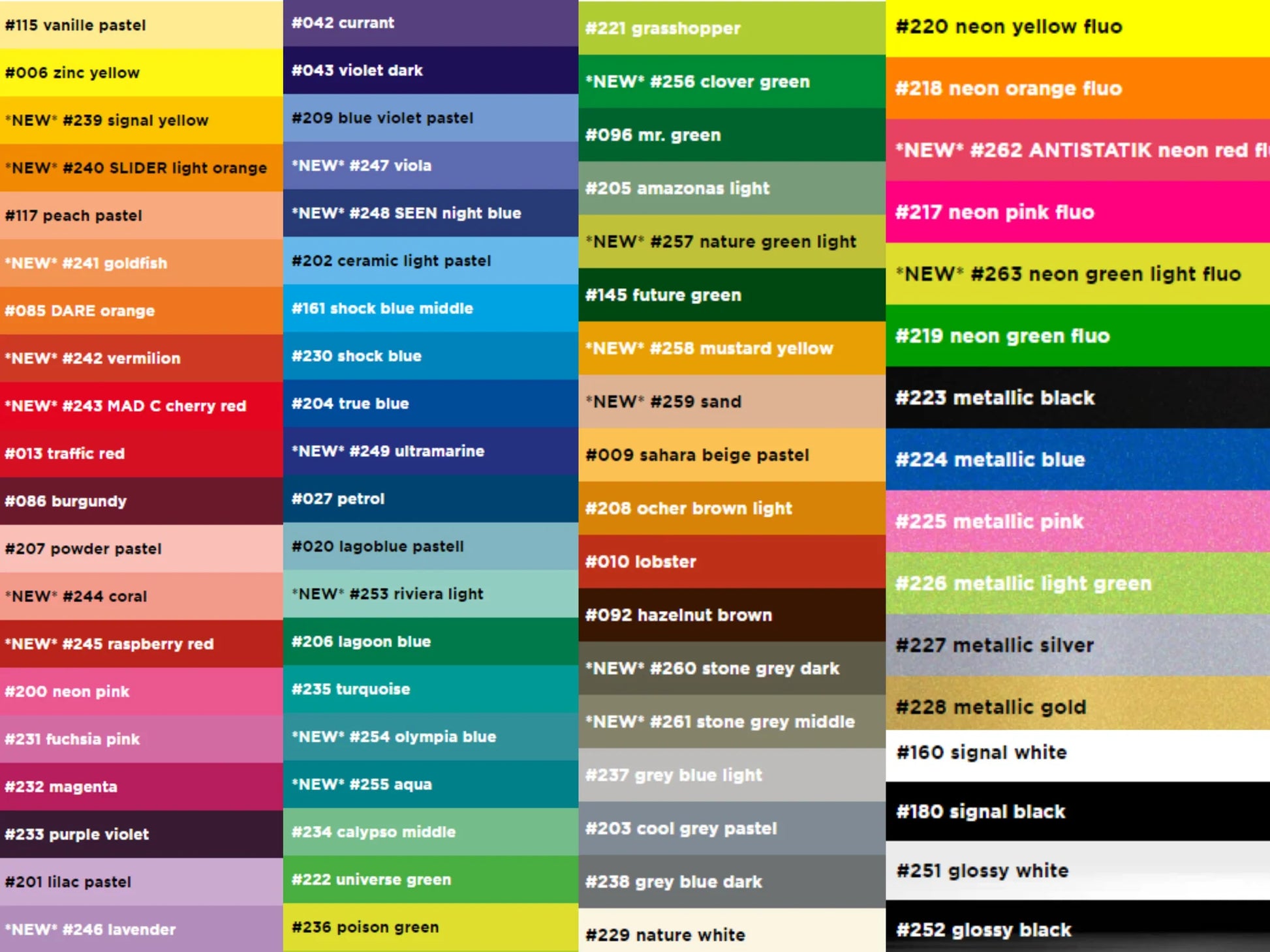 Vanille Pastel, Jaune Zinc, Jaune Signal, Orange Clair Slider, Pêche Pastel, Poisson Rouge, Orange Dare, Vermillon, Rouge Cerise Mad C, Rouge Trafic, Rouge Bourgogne, Rose Poudré, Corail, Rouge Framboise, Rose Néon, Rose Fuchsia, Magenta, Pourpre, Lilas Pastel, Lavande, Cassis, Violet Foncé, Bleu Violet Pastel, Violette, Bleu Nuit Seen, Bleu Choc Moyen, Ceramic Pastel Clair, Bleu Choc, Bleu Juste, Bleu Outremer, Pétrole, Bleu Lagon Pastel, Rivière Clair, Bleu Lagon, Turquoise, Bleu Olympe, Aqua, Calypso Moyen, Universe Green, Vert Poison, Vert Sauterelle, Vert Trèfle, Mr Green, Amazone Clair, Vert Nature Clair, Vert Futur, Jaune Moutarde, Sable, Beige Sahara Pastel, Brun Ocre Clair, Homard, Noisette, Gris Pierre Foncé, Gris Pierre Moyen, Gris Bleu Clair, Gris Cool Pastel, Gris Bleu Foncé, Blanc Nature, Blanc Signal, Noir Signal, Blanc Glossy, Noir Glossy, Jaune Néon Fluo, Orange Néon Fluo, Rouge Fluo Antistatik, Rose Néon Fluo, Vert Clair Fluo, Vert Néon Fluo, Noir Métallique, Bleu Métallique, Rose Métallique, Vert Métallique, Argenté Métallique, Doré Métallique.