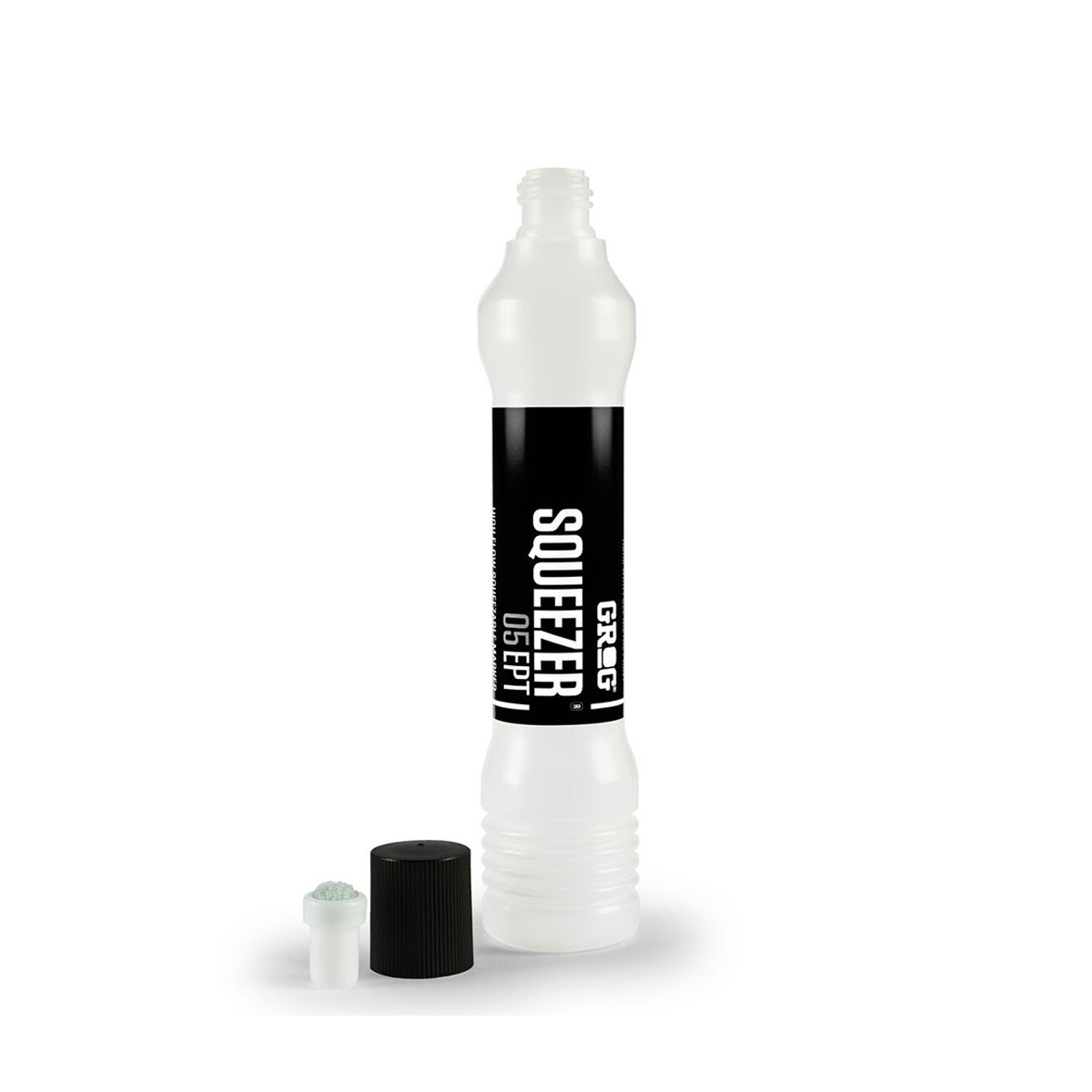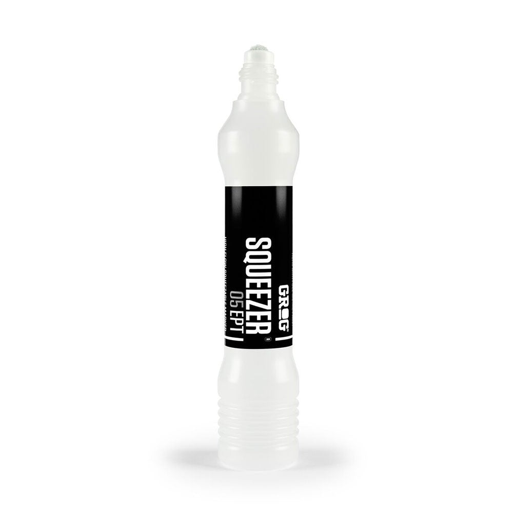 Corps transparent pour maîtriser le débit et réaliser des appels d'encre, grande contenance, confort de marquage : le Grog Squeezer dans sa version la plus fine, idéale pour réaliser des tags détaillés, du calligraffiti et même des inscriptions ou coulures sur toiles.